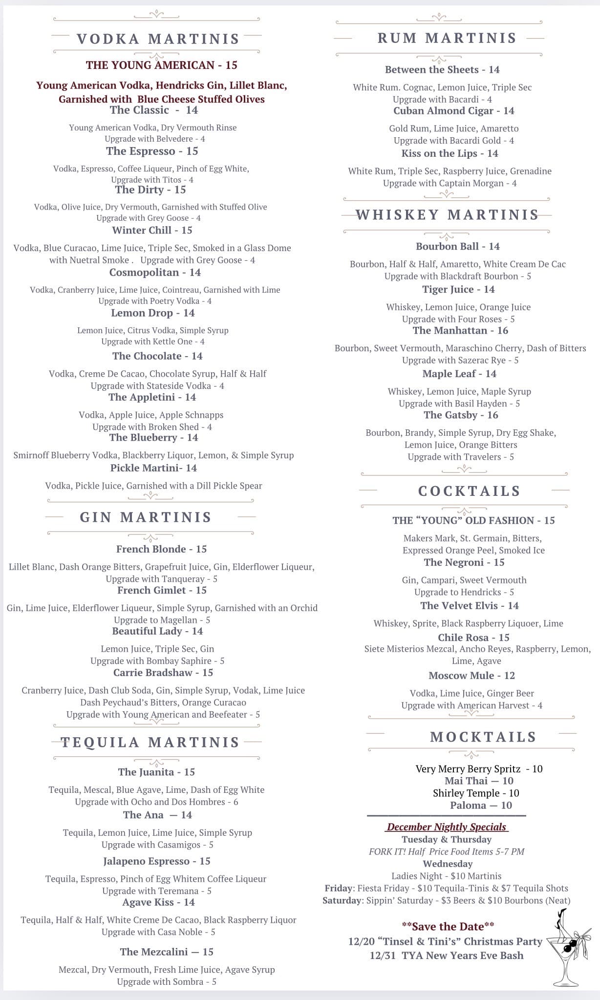 Step into The Young American, Martinsburg’s newest upscale martini bar, where classic elegance meets modern sophistication. Enjoy expertly crafted cocktails, premium spirits, and a chic ambiance perfect for a night out. Whether you’re savoring a signature martini or exploring the curated drink menu, every visit promises a refined experience. Ideal for date nights, celebrations, or unwinding with friends. Discover the perfect blend of style and taste at The Young American.
